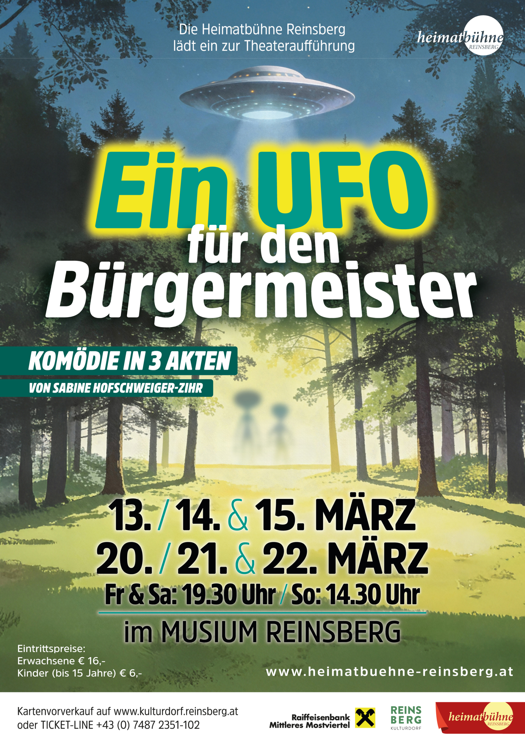 Die Heimatbühne Reinsberg bringt 2026 ein besonderes Theaterereignis auf die Bühne: die Uraufführung des Stücks: „Ein Ufo für den Bürgermeister“ von Sabine Hofschweiger-Zihr. Das Stück wurde eigens für die Reinsberger Schauspielgruppe geschrieben und feiert im MUSIUM seine Premiere. Seit vielen Jahren begeistert die Heimatbühne mit Leidenschaft, Humor und Gespür für regionale Themen – getragen vom großen Einsatz der Mitwirkenden und der Begeisterung des Publikums. Auch im März 2026 darf man sich wieder auf unterhaltsames Volkstheater und einen liebevoll inszenierten Theaterabend freuen.
